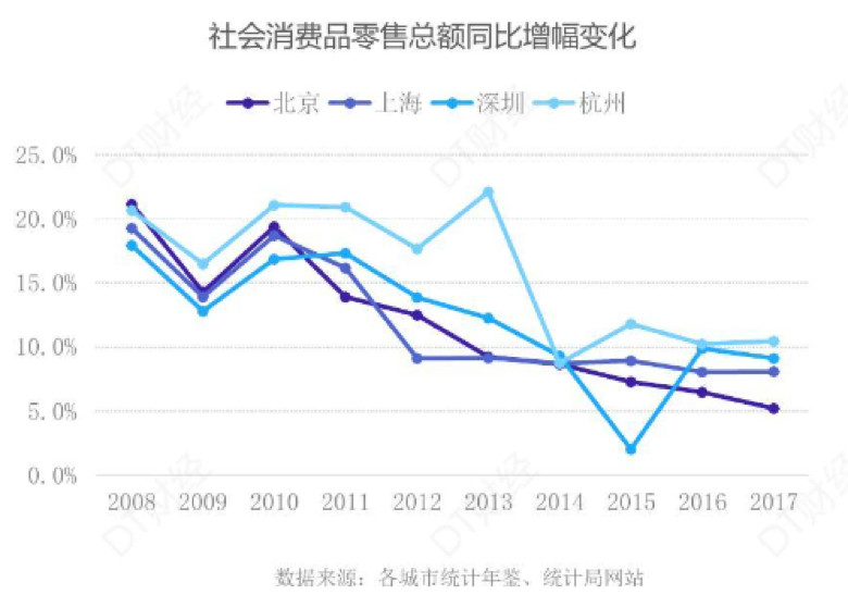 杭州的零售体量与根基无法与北京、上海、深圳相比,但增长势头却数一数二。2008年至2017年这十年,高达15%的社消零售总额年复合增长率,让杭州获得了显著的增长势能。